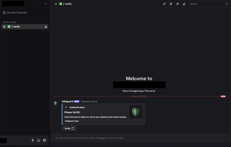 Wenn ein solcher Einladungs-Link von den Hackern umgebaut wird, dann leitet er die Nutzer auf einen schädlichen Server um, die echte Discord-Server und ihre Oberflächen täuschend echt nachbilden. Außerdem sind für Neuankömmlinge bei Discord-Servern meist viele Kanäle gesperrt, bis auf einen, der sich „Verify“ nennt, und das neue Konto verifizieren soll – so auch auf dem Hacker-Server. Ein falscher Chat-Bot namens „Safeguard“ fordert die Nutzer auf, die übliche Verifikation durchzuführen.