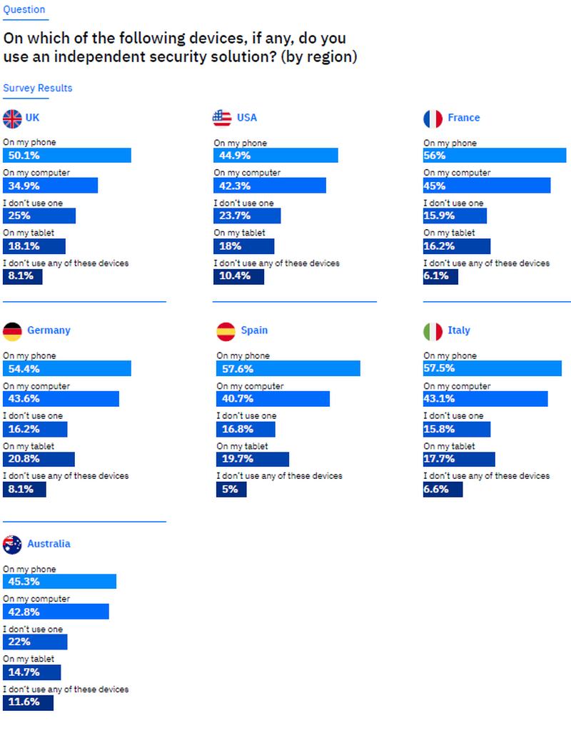 Mobile- und Gerätesicherheit wird oft vernachlässigt: 47,7 % (in D: 45,5 %) der Befragten nutzt keine Drittanbieter-Sicherheitslösung auf ihrem Smartphone, obwohl 53,3 Prozent (in D: 50,9 %) sensible Transaktionen wie Rechnungszahlungen oder Online-Shopping auf ihrem privaten Smartphone durchführen. Auch der Schutz anderer Geräte ist mangelhaft: 58,2 Prozent der Befragten (D: 56,4 %) sichern ihre Computer nicht mit Sicherheitslösungen von Drittanbietern, bei Tablets sind es sogar 82,1 Prozent (D: 79,2 %). Am niedrigsten ist die Quote der Nutzer, die ihre Smartphones schützen, in den USA mit 44,9 %, am höchsten in Spanien (57,6 %) und Italien (57,5 %). Deutschland liegt hier mit 54,5 % auf Rang Vier. Besorgniserregend ist, dass 8,4 Prozent – in D: 8,3 % – zugaben, Arbeitsgeräte für persönliche Finanztransaktionen zu nutzen, was sowohl für den Einzelnen als auch für die Organisation ein Risiko darstellt.
