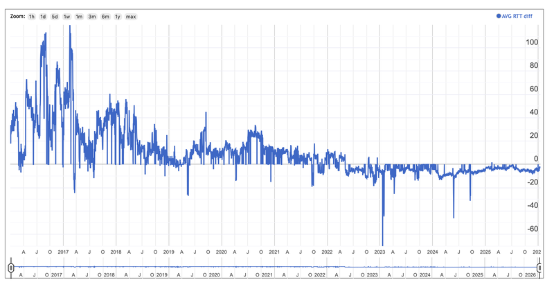 APNIC sammelt seit vielen Jahren die Round-Trip-Zeiten (RTT) für IPv4 und IPv6. In der dargestellten Grafik wird die IPv4-Latenz von der IPv6-Latenz abgezogen. Ist die IPv6-Latenz um Millisekunden niedriger ist als die IPv4-Latenz, dann ergibt sich ein negativer Wert. Noch vor einigen Jahren wurde die IPv6-RTT-Messungen durch viele mobile Geräte beeinflusst, die bereits ausschließlich IPv6-Kommunikation verwenden und Protokollübersetzer passieren mussten, um ausschließlich IPv4-Websites und -Anwendungen zu erreichen. Inzwischen hat sich der Leistungsunterschied vergrößert, da immer mehr Endgeräte und Anwendungen über reines IPv6 kommunizieren.