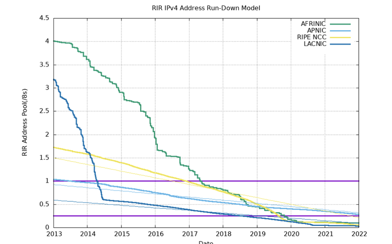 In der nachfolgenden Grafik wird der Verbrauch der 5 RIRs weltweit dargestellt und man kann die Knappheit an öffentlichen IPv4-Adressen erkennen.